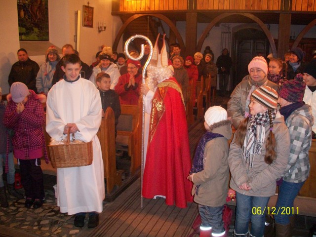 Tradycyjnie 6 grudnia św. Mikołaj odwiedził naszą parafię. W tym roku przybył o godzinie siódmej rano, gdzie zastał nas czuwających na modlitwie. Jakież było zdziwienie wszystkich, gdy ów święty Biskup powitał wszystkich chrześcijańskim pozdrowieniem a następnie dziękując za dobro, które uczynili mieszkańcy w ciągu roku wynagrodził ich słodkim poczęstunkiem. Ponoć przez cały dzień można Go było zauważyć w mieście pod Szrenicą. Odwiedził także Klub Seniora na spotkaniu w restauracji Polonia. Mamy nadzieję, że za rok znowu się z nim spotkamy…