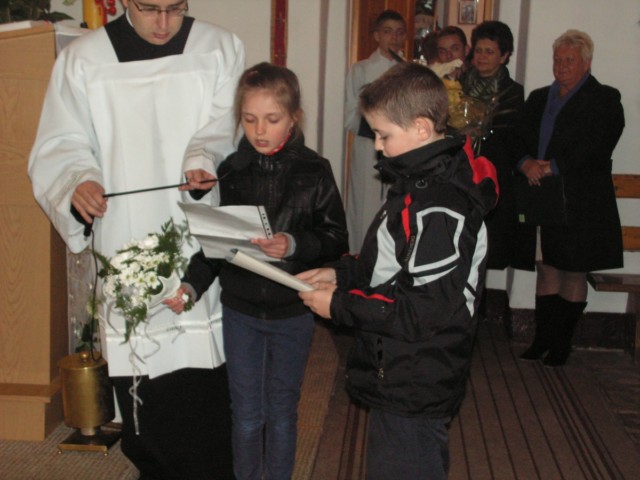 Przywitanie przed kościołem, przebiegające w gęstej mgle, kontynuowane było także wewnątrz, gdzie figurę powitały dzieci, Liturgiczna Służba Ołtarza oraz przedstawiciele parafii.
