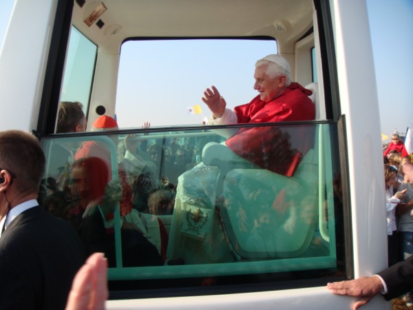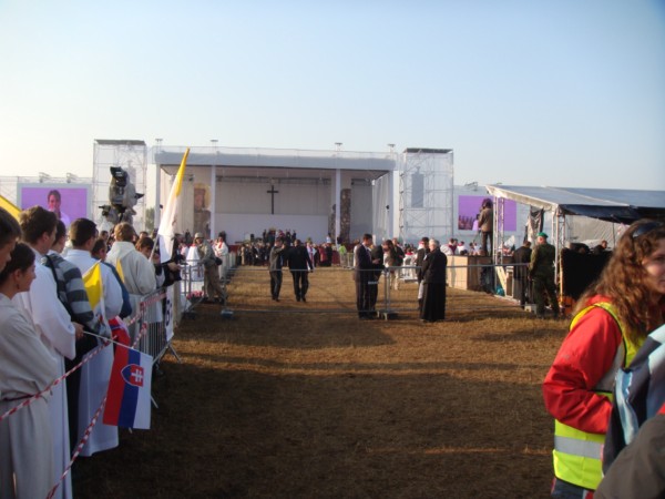 Na spotkanie z Papieżem jedzie autokarem grupa 58 pielgrzymów pod opieką kleryka Norberta. Jest kilku ministrantów, są osoby zakonne, trochę młodzieży i trochę bardziej dojrzałej młodzieży. Podróż mija nam przyjemnie na wspólnej modlitwie i wspólnym śpiewaniu. W oparach mgły wjeżdżamy do miasta, autokar za autokarem, mundurowi sprawnie kierują ruchem. Na miejsce spotkania z Benedyktem XVI, trzeba maszerować. Idziemy w chłodnym rześkim poranku, szeroka ławą, mieszają się języki: czeski, polski, słowacki, niemiecki. Nad nami krąży helikopter. Przez mgłę przebija się wielkie czerwone wschodzące słońce. Dodaje uroku i nadziei, że będzie cieplej. Zza zakrętu wyłania się w oddali, w szacie z mgieł Bazylika, kościół przed którym zginął św. Wacław i w którym są jego szczątki. Docieramy na błonia Starej Boleslav, W oddali widać przygotowany ołtarz, duży, jasny, skromny, na placu są wieże z metalowych konstrukcji do nagłośnienia, dla kamerzystów i są na szczęście wielkie ekrany. Mamy miejscówki w sektorze A6, dość odległe miejsce od ołtarza. Nasza młodzież i osoby duchowne mają bliższy sektor – C1. Pocieszamy się, że to co będzie do oglądania, zobaczymy na ekranach.